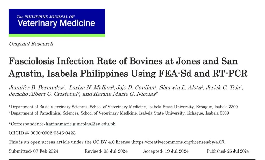Background: Fasciolosis is a major trematode infection that is zoonotic, but its prevalence is underreported in the Philippines. In Isabela province, Fasciola spp. is a constant finding in slaughtered bovines. Methods: The infection rate of Fasciola spp. in 206 cattle and carabaos in Jones and San Agustin, Isabela, Philippines was investigated through fecalysis using the Formalin Ethyl Acetate Sedimentation (FEA- Sd) technique. Parallel blood samples were collected from a subgroup of 50 animals for the detection of the cathepsin L gene using Reverse- Transcription Polymerase Chain Reaction (RT-PCR). Association between infection with Fasciola spp. and bovine species, sex, age, and place of origin was tested using the Chi- Square Test. Results: Sixty–eight (33.0%) of the bovines examined revealed Fasciola gigantica eggs in their feces. No statistically significant associations were recorded between F. gigantica infection with sex, age, and origin of the bovines. RT-PCR showed a higher detection rate of infection (100.0%) than FEA-Sd (54.0%) where a 250-bp cDNA probe was generated which amplified the DNA encoding for the cathepsin L protein in plasma. Conclusions: Our data confirm the