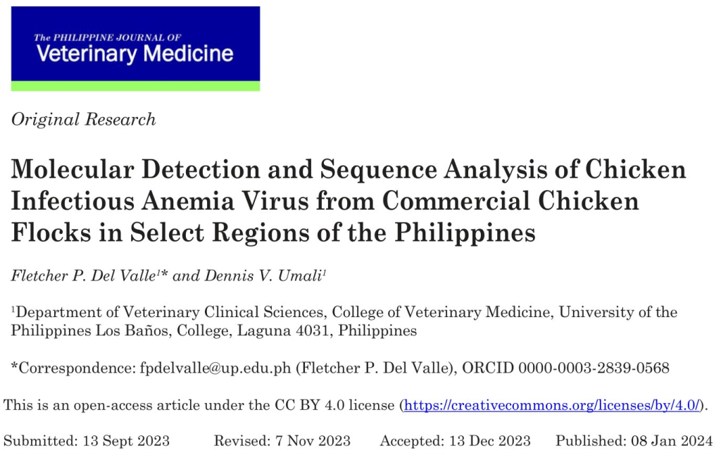 Background: Chicken infectious anemia virus (CAV) is a ubiquitous pathogen that usually affects young chickens. Clinical infection leads to anemia, lethargy, immunosuppression, and increased mortality. Methods: In this study, 12 Philippine provinces from 5 regions were selected for sampling and testing against CAV using PCR assay. Oropharyngeal-cloacal swabs (OPCs), combined OPCs with tissues, and tissue samples were taken from cooperating breeder, broiler breeder, and layer farms. Results: The overall CAV positivity rate of the collected samples from commercial chicken flocks is 7.26% (34/468). Based on the flock type, a positivity rate of 29.79% (14/47), 11.19% (15/134), and 1.77% (5/282) were detected in layer, breeder, and broiler flocks, respectively. Based on the region, a positivity rate of 1.31% (4/305) and 21.74% (30/138) were detected from Regions III and IVA, respectively. Nucleic acid sequencing and phylogenetic analysis of selected samples showed clustering under genotype D1. Conclusions: The results describe the current CAV situation in commercial chicken flocks from different provinces and their relationship with other strains. Apparently, CAV detection was moderately associated with flock type and region; and weakly associated with flock age and sample type. The local CAV strains from this study were closely related (98.26-99.62%) to Chinese and Taiwanese strains.