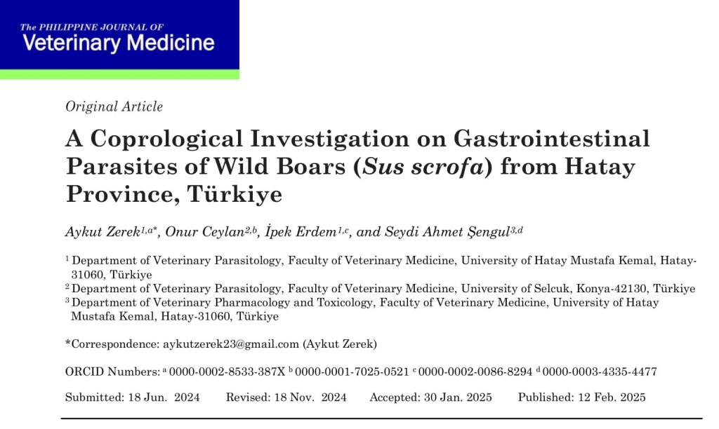Background: Research on disease surveillance in wildlife species is of fundamental importance for understanding the epidemiology of zoonotic diseases. Methods: Fecal samples were collected from 24 wild boars in the districts of Antakya, İskenderun, and Kırıkhan in Hatay province during the years 2018-2019. The Fülleborn flotation and Benedek sedimentation methods were applied to these samples. Additionally, feces were examined for the presence of Cryptosporidium spp. oocysts using Kinyoun acid-fast staining and nested PCR methods. Results: Microscopic examination revealed that 14 animals (58.33%) were infected with one or more parasite species. The prevalence rates of gastrointestinal parasites were as follows: Eimeria spp. 45.83%, Metastrongylus spp. 20.83%, Ascaris suum 20.83%, Strongyloides spp. 12.5%, and Oesophagostomum spp. 8.33%. Furthermore, no Cryptosporidium spp. was detected in any of the fecal samples. The infection rate was higher in male boars (64.70%) compared to females (42.85%). According to the results of Fisher’s Exact Test, there was a statistically significant difference in parasite presence among the sampled districts, while no significant difference was found between parasite presence and sex. Conclusions: In conclusion, this study indicates that wild boar populations can serve as potential reservoirs of parasites for both animals and humans.
