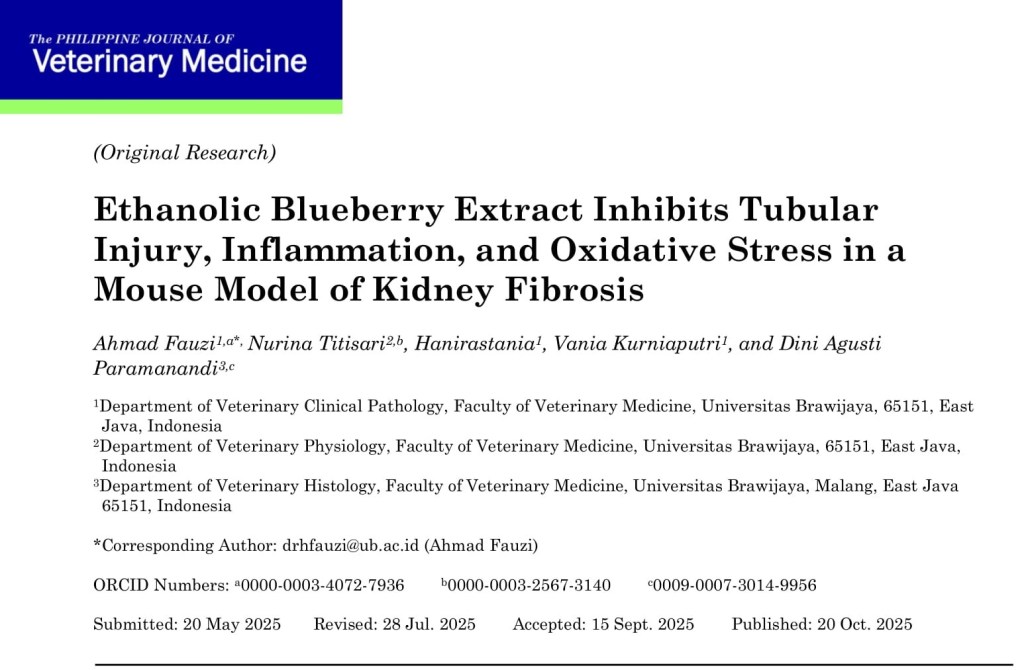Background: Kidney fibrosis is a progressive condition characterized by tubular injury, inflammatory cell infiltration, and oxidative stress resulting from increased reactive oxygen species. The blueberry exhibits strong antioxidant and anti-inflammatory properties, rendering it a promising natural therapy for inhibiting kidney damage. This study aimed to evaluate the therapeutic effects of this extract on tubular injury scores, the number of inflammatory cells, interleukin-1 beta (IL-1β) expression, and malondialdehyde (MDA) levels in a Swiss Webster mouse model of kidney fibrosis. Methods: An experimental design was conducted using 25 male Swiss Webster mice, divided into five groups: a control group and four groups with unilateral ureteral obstruction (UUO), with or without blueberry extract therapy. The crude 70% ethanolic blueberry (Vaccinium corymbosum) extract was administered orally (1500 mg/kg body weight) via gavage for 7 or 14 days, followed by histological and biochemical analysis of the harvested kidneys. Results: UUO significantly increased tubular injury, inflammatory cell infiltration, IL-1β expression, and MDA levels compared to the control group. Mice treated with blueberry extract showed a 22–13% reduction in tubular injury scores, a 25–21% decrease in inflammatory cell counts, a 39–34% reduction in IL-1β expression, and a 7–5% decline in MDA levels at 7 and 14 days, respectively. These therapeutic effects were attributed to the extract’s ability to suppress inflammation and inhibit lipid peroxidation triggered by oxidative stress. Conclusions: The crude ethanolic extract of Vaccinium corymbosum demonstrates significant potential as a natural therapeutic agent in reducing kidney damage, inflammation, and oxidative stress in kidney fibrosis.