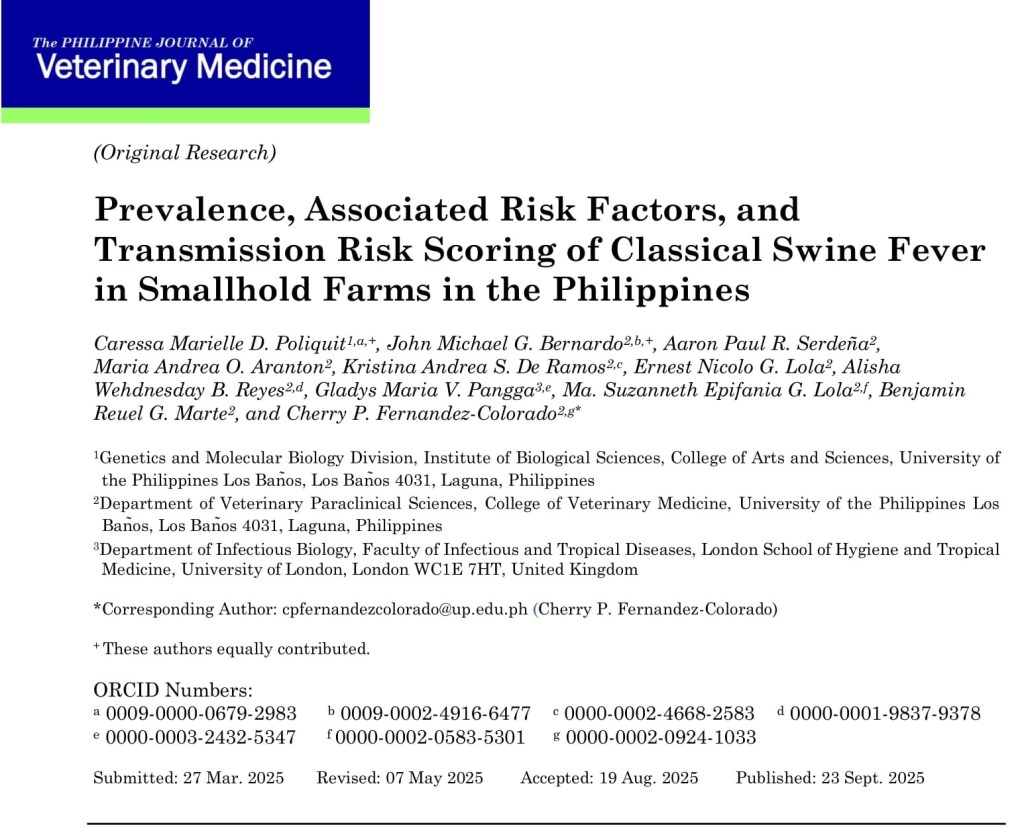 Background: Classical swine fever (CSF) is a notifiable disease, and the limited epidemiological data in the Philippines underscores the need for effective disease surveillance. Methods: This study aimed to determine the prevalence of antibodies against CSF virus (CSFv) using enzyme-linked immunosorbent assay and CSFv RNA using real-time reverse transcription polymerase chain reaction in pigs from smallhold farms in 21 Philippine provinces. The association between seropositivity and factors from interviews of abattoir officers was analyzed using the least absolute shrinkage selection operator regression. A semi-quantitative method was also adapted to estimate the transmission risk. Results: Our study found an overall seroprevalence of 36.0% (153/425, 95% Confidence Interval: 31.5%-40.8%), while all 423 samples tested negative for CSFv. A positive association was found in water treatment, swill feeding, CSF vaccination, and keeping vaccination records, while CSF history, proximity to residential areas, and raising native pigs negatively impacted seropositivity. Nueva Ecija was considered high-risk for CSF transmission, while others fell within the moderate, low, and very low risk categories. Conclusions: Our findings highlight the CSF seroprevalence and factors to consider for improved prevention and control. Classifying the provinces according to transmission risk also provided insights on future targeted surveillance and efficient resource allocation.